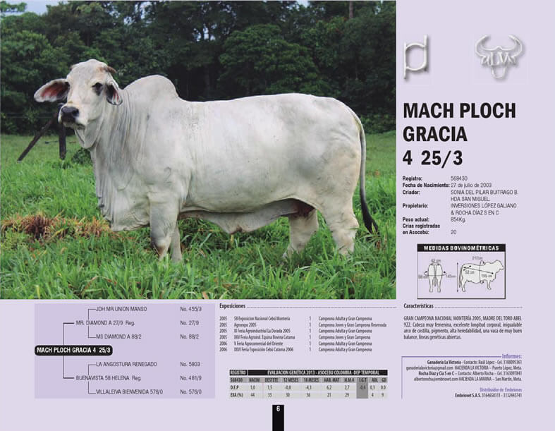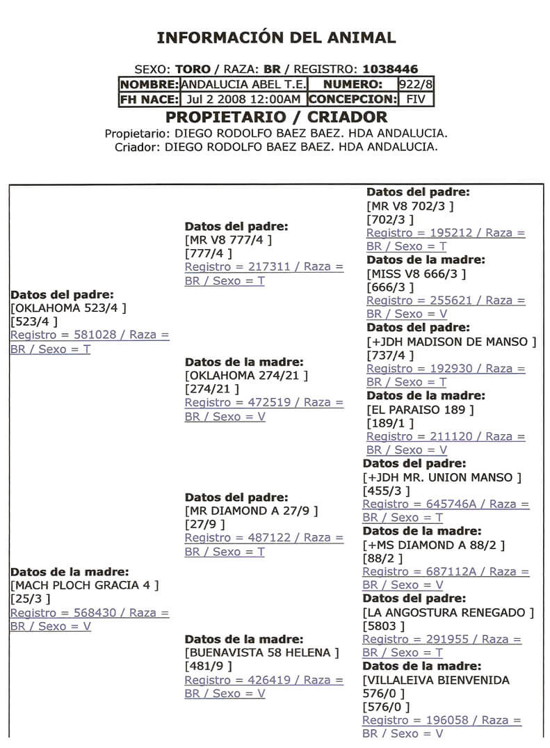 NOMBRE COMPLETO: ANDALUCIA ABEL 922/8TE NÚMERO: 922/8 REGISTRO: 1038446 FECHA DE NACIMIENTO: 07/02/2008 TIPO: CARNE – RAZA: BRAHMAN GRIS PADRE: OKLAHOMA 523/4 MADRE: MACH PLOCH GRACIA 4