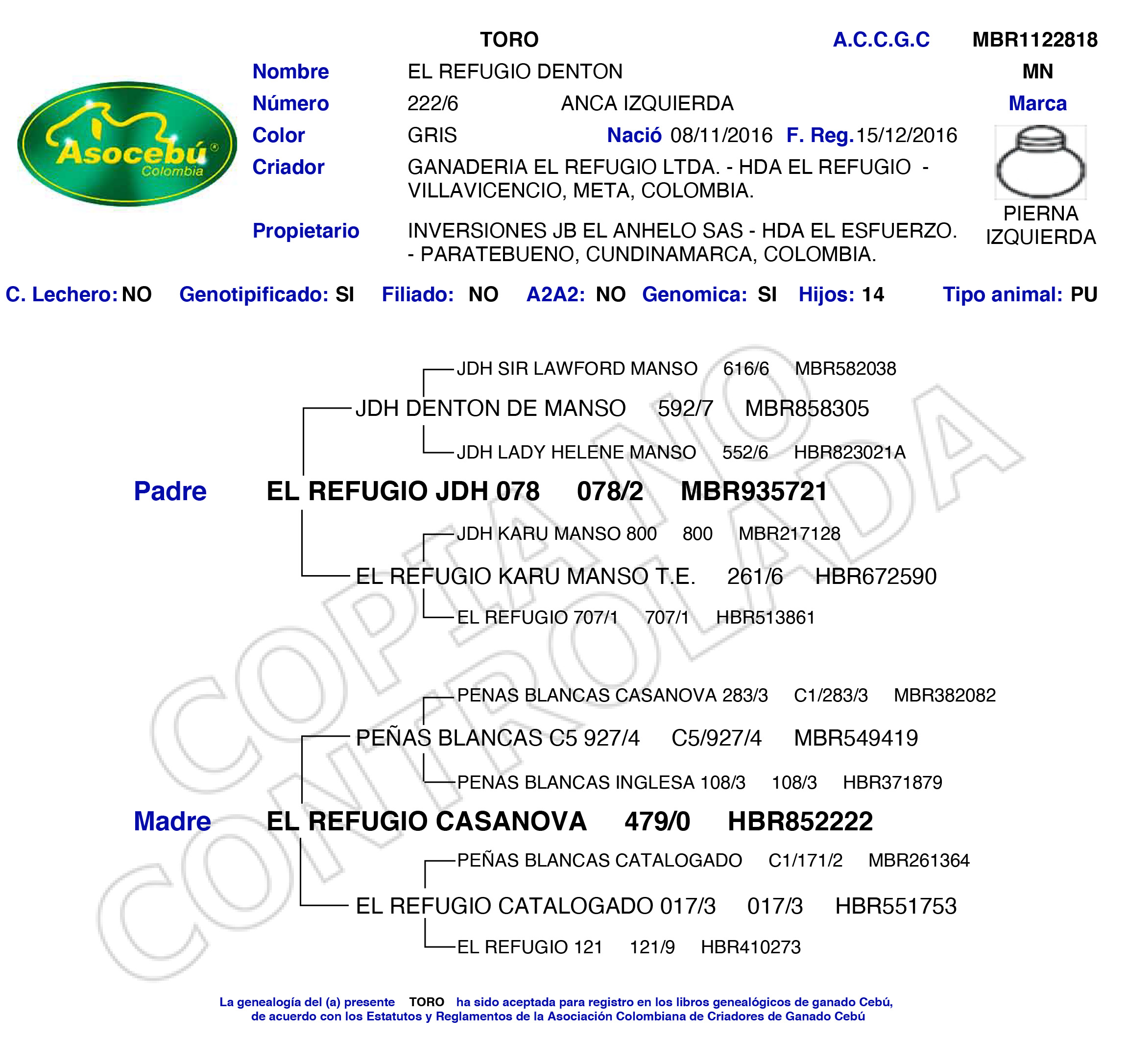 Denton es un reproductor que destaca por su pigmento, masculinidad y una musculatura excepcional. Es un probado productor de carne; sus hijos han ganado en tres ocasiones el concurso de ganado gordo de Asocebu. Además, su descendencia femenina se caracteriza por pezones cortos deseables, alta fertilidad y gran habilidad materna.