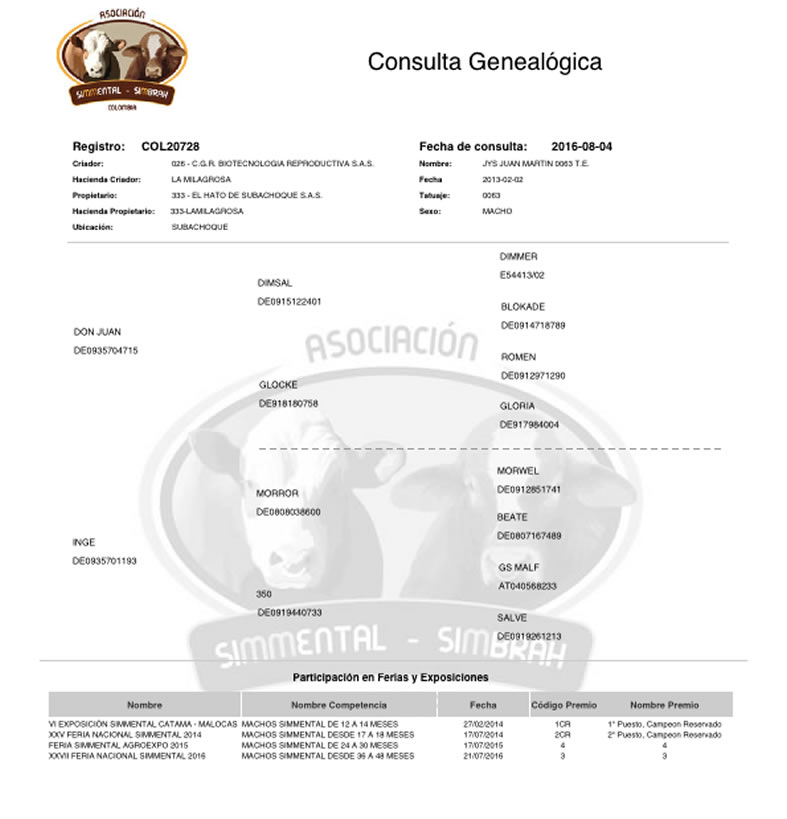 NOMBRE COMPLETO: JYS Juan Martín 0063 T.E.NÚMERO: 0063 REGISTRO: COL20728 FECHA DE NACIMIENTO: 02/02/2013TIPO: D.P. – RAZA: SIMMENTALPADRE: DON JUAN MADRE: INGE
