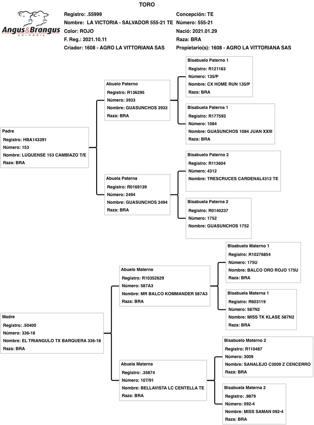 NOMBRE COMPLETO: LA VICTORIA – SALVADOR 555-21 NÚMERO: 555-21 REGISTRO: 55999 FECHA DE NACIMIENTO: 29/01/2021 TIPO: CARNE – RAZA: BRANGUS ROJO PADRE: LUQUENSE 153 CAMBIAZO T/E MADRE: EL TRIANGULO TX BARQUERA 336-18