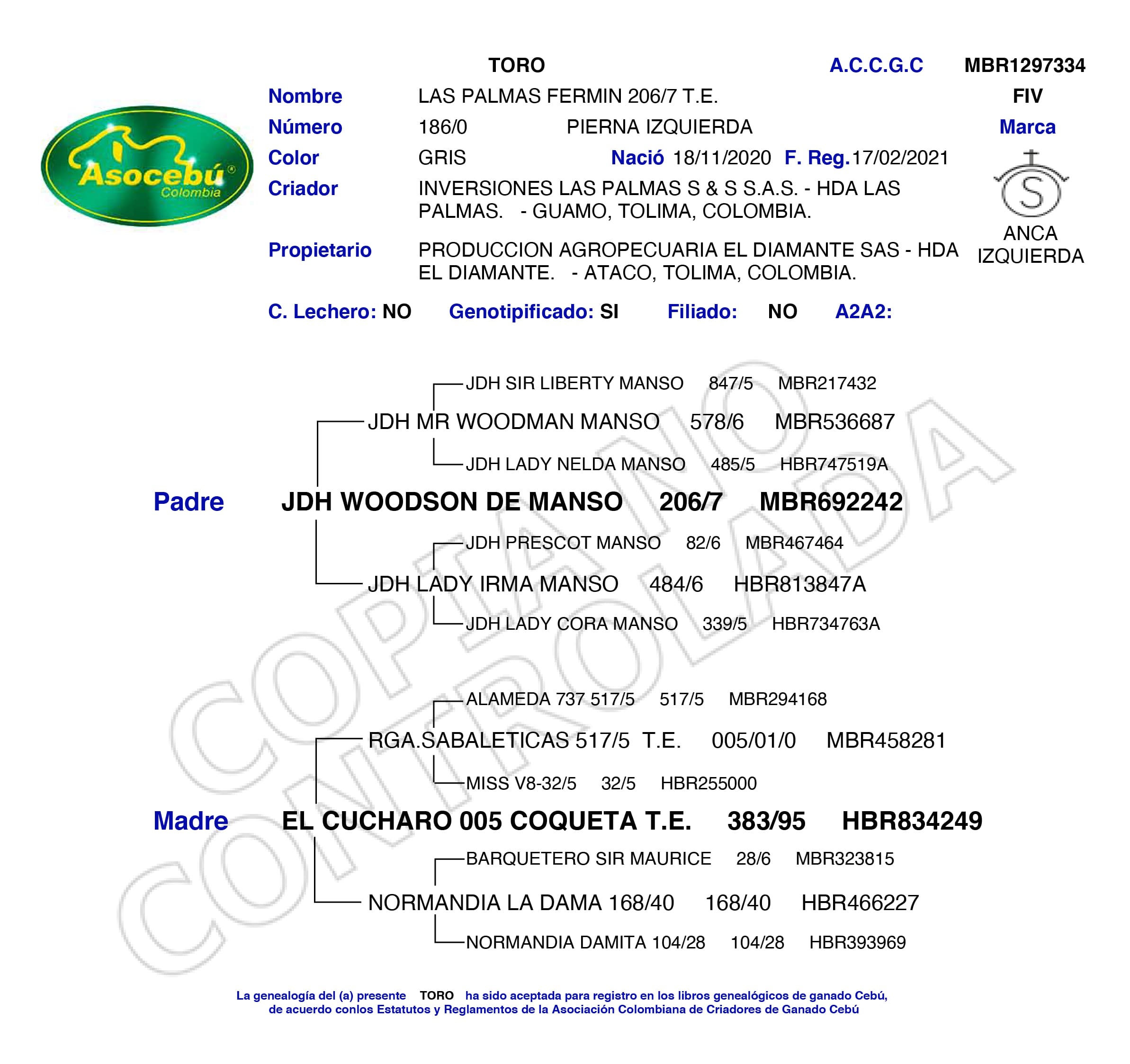 NOMBRE COMPLETO: LAS PALMAS FERMIN 206/7 T.E. NÚMERO: 186/0 REGISTRO: MBR1297334 FECHA DE NACIMIENTO: 18/11/2020 TIPO: CARNE – RAZA: BRAHMAN GRIS PADRE: JDH WOODSON DE MANSO 206/7 MADRE: EL CUCHARO 005 COQUETA T.E.