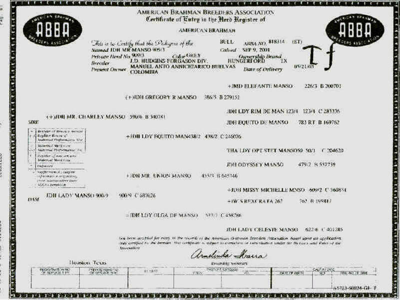 NOMBRE COMPLETO: JDH MR. MANSO 909/3 NÚMERO: 909/3 REGISTRO: 818314 FECHA DE NACIMIENTO: 09/09/2001 TIPO: CARNE – RAZA: BRAHMAN GRIS PADRE: JDH MR CHARLEY MANSO MADRE: JDH LADY MANSO 900
